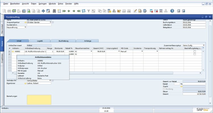 Mit der neuesten Version von SAP Business One 9.2 haben wieder kleine, aber feine Funktionen Einzug in B1 gehalten. Eine davon sind die Tooltips. Diese erscheinen, wenn man mit der Maus über einen goldenen Pfeil im B1 fährt. Z.B. bei einer Artikelnummer oder eine Kundennummer.